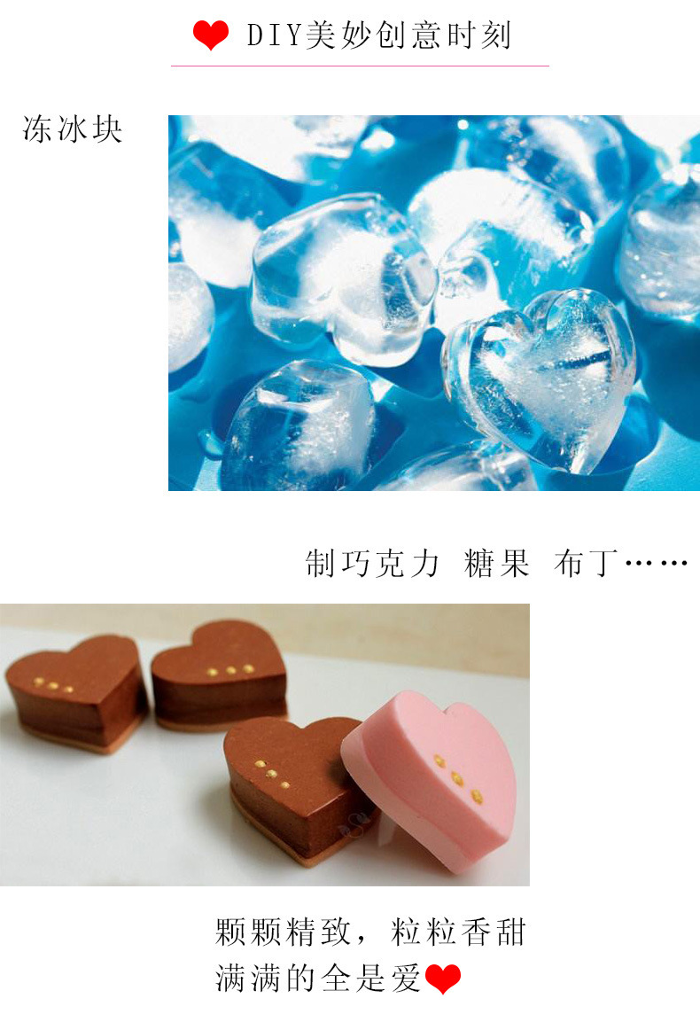 ●愛心冰格適合產(chǎn)品:冰塊布丁、餅干蛋糕、慕司果凍、調(diào)理食品、巧克力等均可使用。
