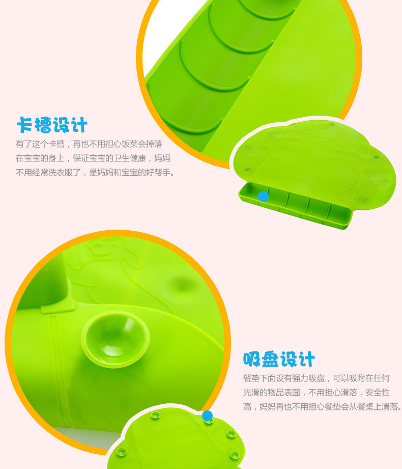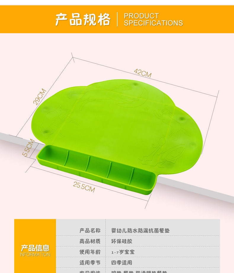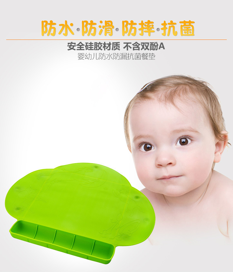 3、防水抗菌餐墊,卡通圖案讓寶寶享受快樂的用餐環(huán)境,不用擔(dān)心餐桌或者其他地方的細(xì)菌會感染給寶寶,媽