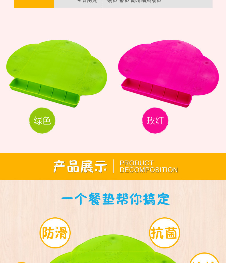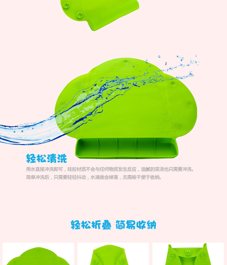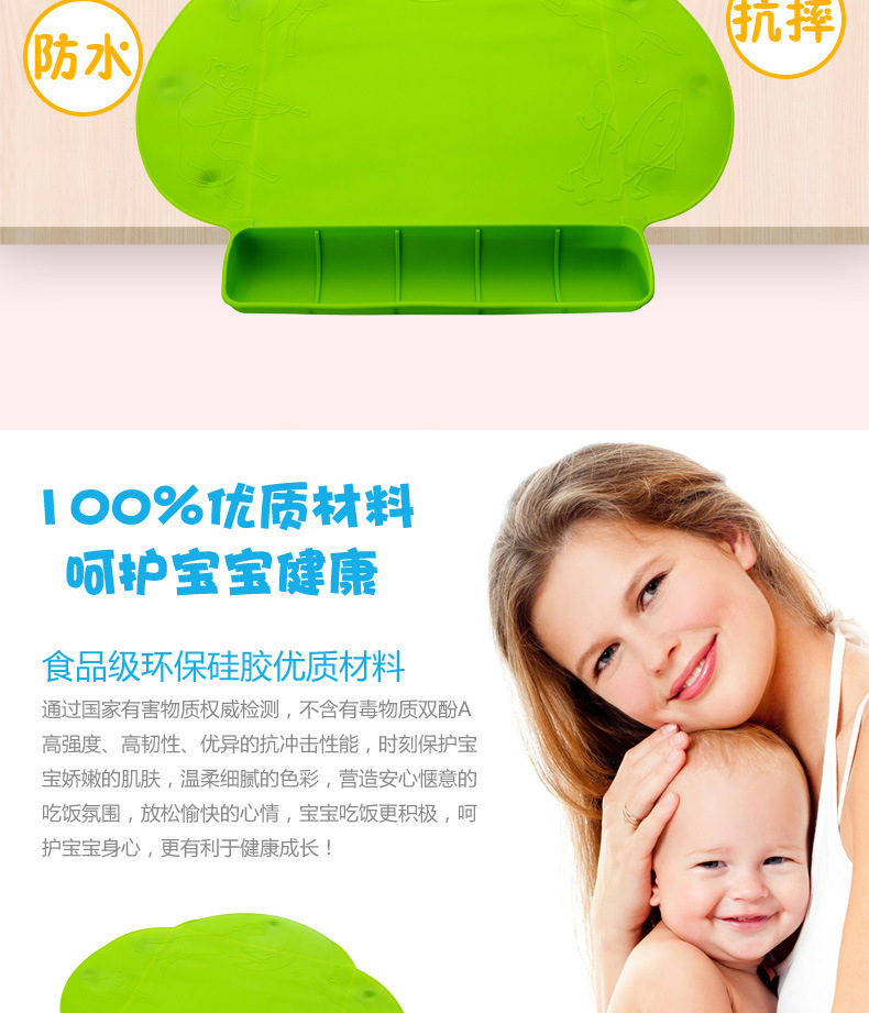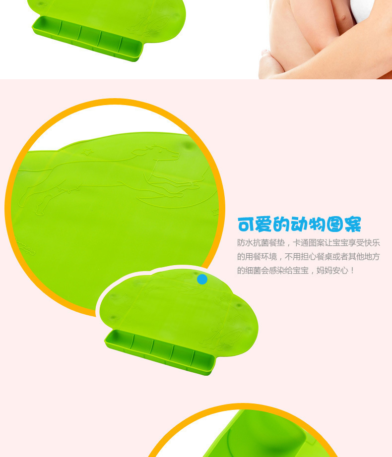 3、防水抗菌餐墊,卡通圖案讓寶寶享受快樂的用餐環(huán)境,不用擔(dān)心餐桌或者其他地方的細(xì)菌會感染給寶寶,媽媽安心!