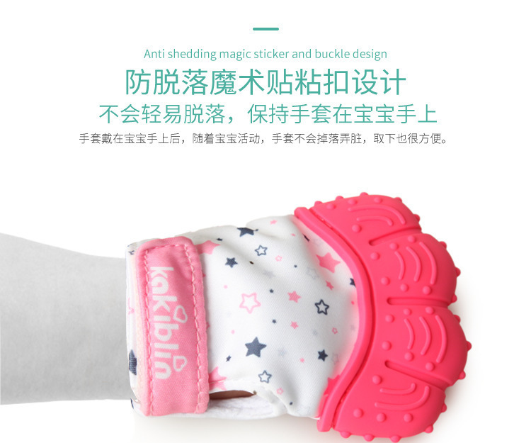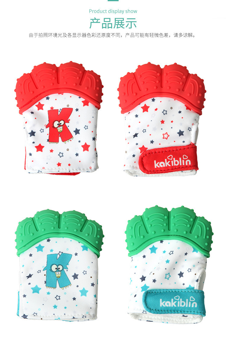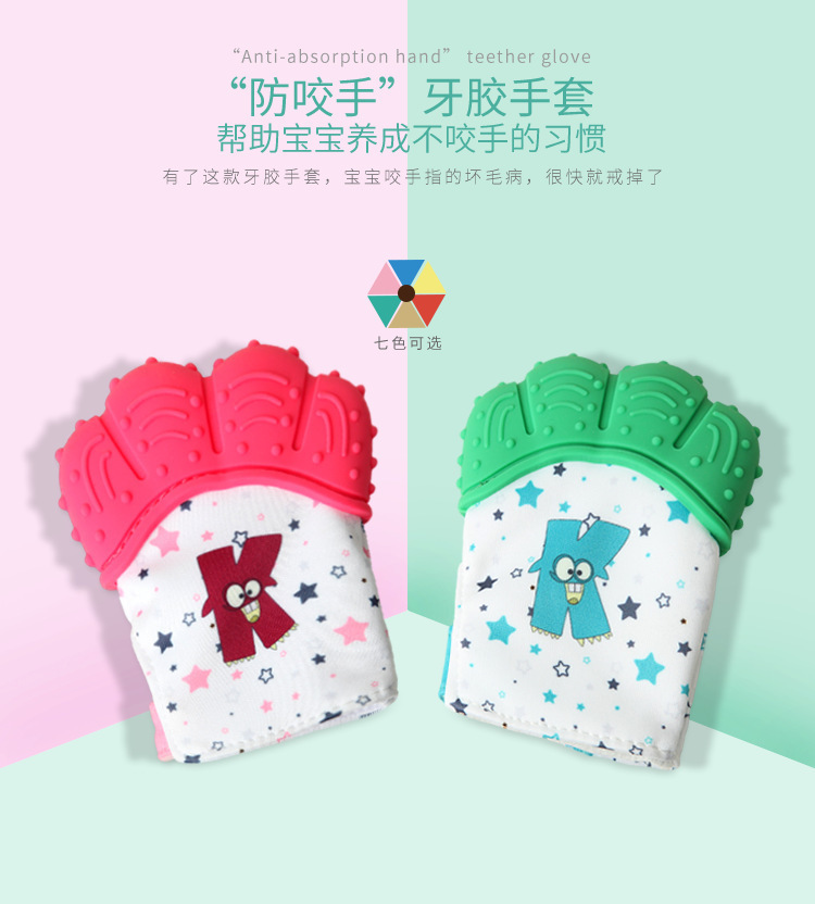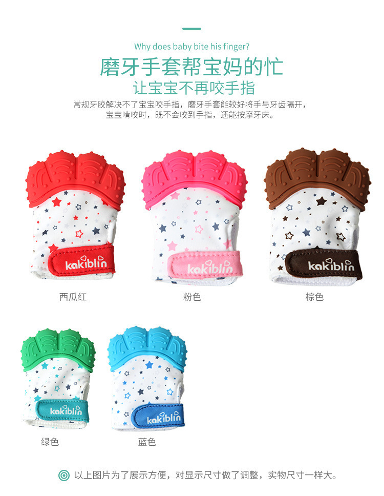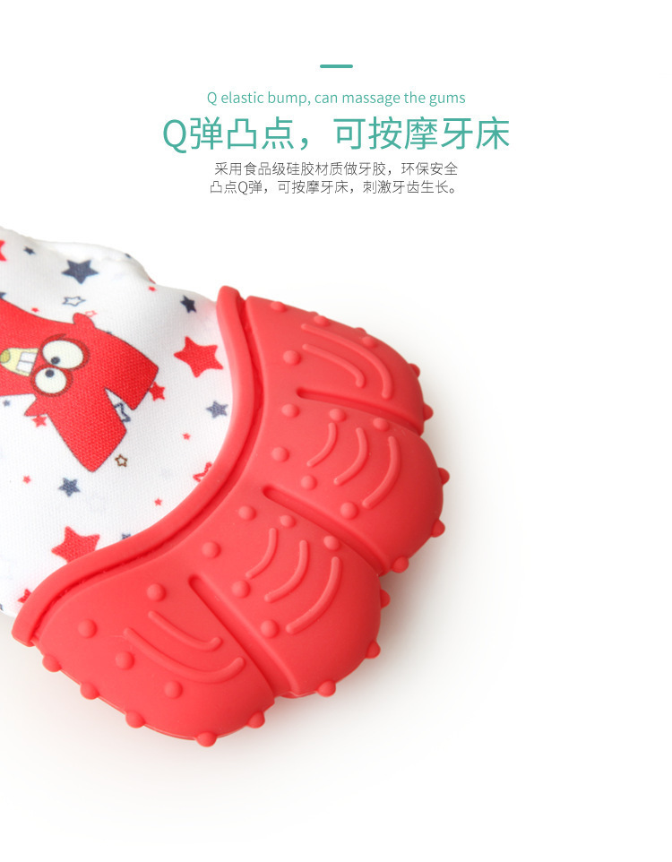產(chǎn)品用途:牙膠手套可以更好的將手和牙齒隔開,寶寶啃咬時(shí),既不會(huì)咬到手指,還可以按摩牙床。