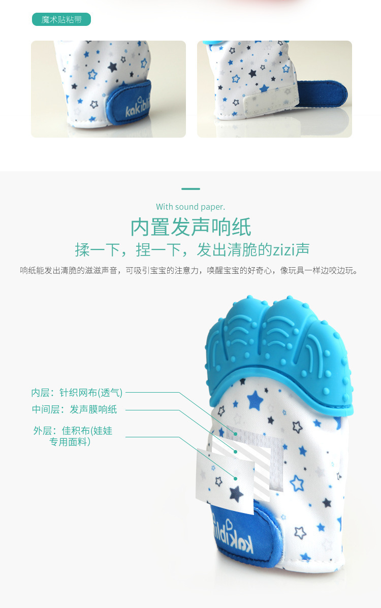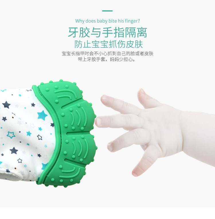 4、常規(guī)牙膠解決不了寶寶咬手指,磨牙手套能較好將手與牙齒隔開,寶寶啃咬時(shí),既不會(huì)咬到手,還能按摩牙床。