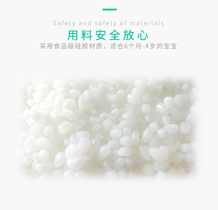 4、用料安全放心,采用食品級(jí)硅膠材質(zhì),適合6個(gè)月-4歲的寶寶
