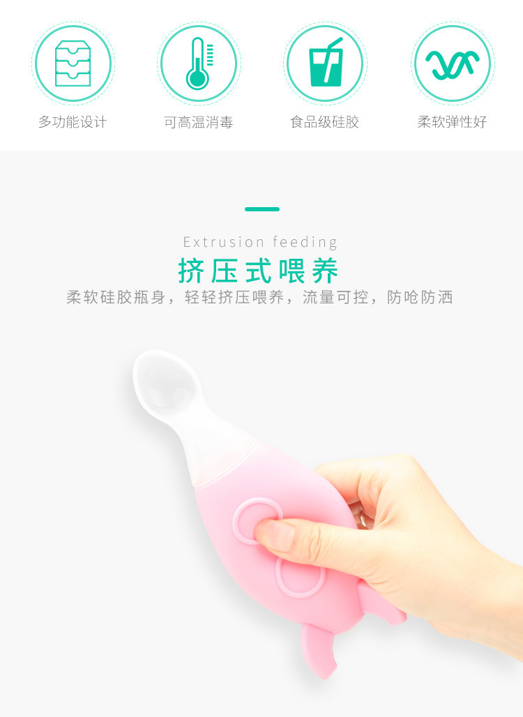 1、碗勺一體,輕松喂養(yǎng),擠壓式設(shè)計(jì),解放雙手,解決喂養(yǎng)煩惱
