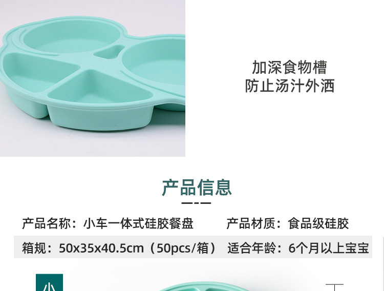 小汽車硅膠餐盤三格造型設(shè)計(jì)隔開餐盤,能將食材井然有序、整齊的擺放在餐盤中,覺得順手一搭,隨意安個(gè)哪些食物都十分美味可口,令人胃口增長(zhǎng)。即是寶寶輔食大咖,也是寶媽媽們拍照pose的符石。擔(dān)憂小寶寶在用餐的那時(shí)候把當(dāng)場(chǎng)秒變“災(zāi)禍當(dāng)場(chǎng)”——將碗弄翻、砸土里摔壞,下手這個(gè)廚具的寶媽媽們盡能夠安心,耐!摔!砸不碎!